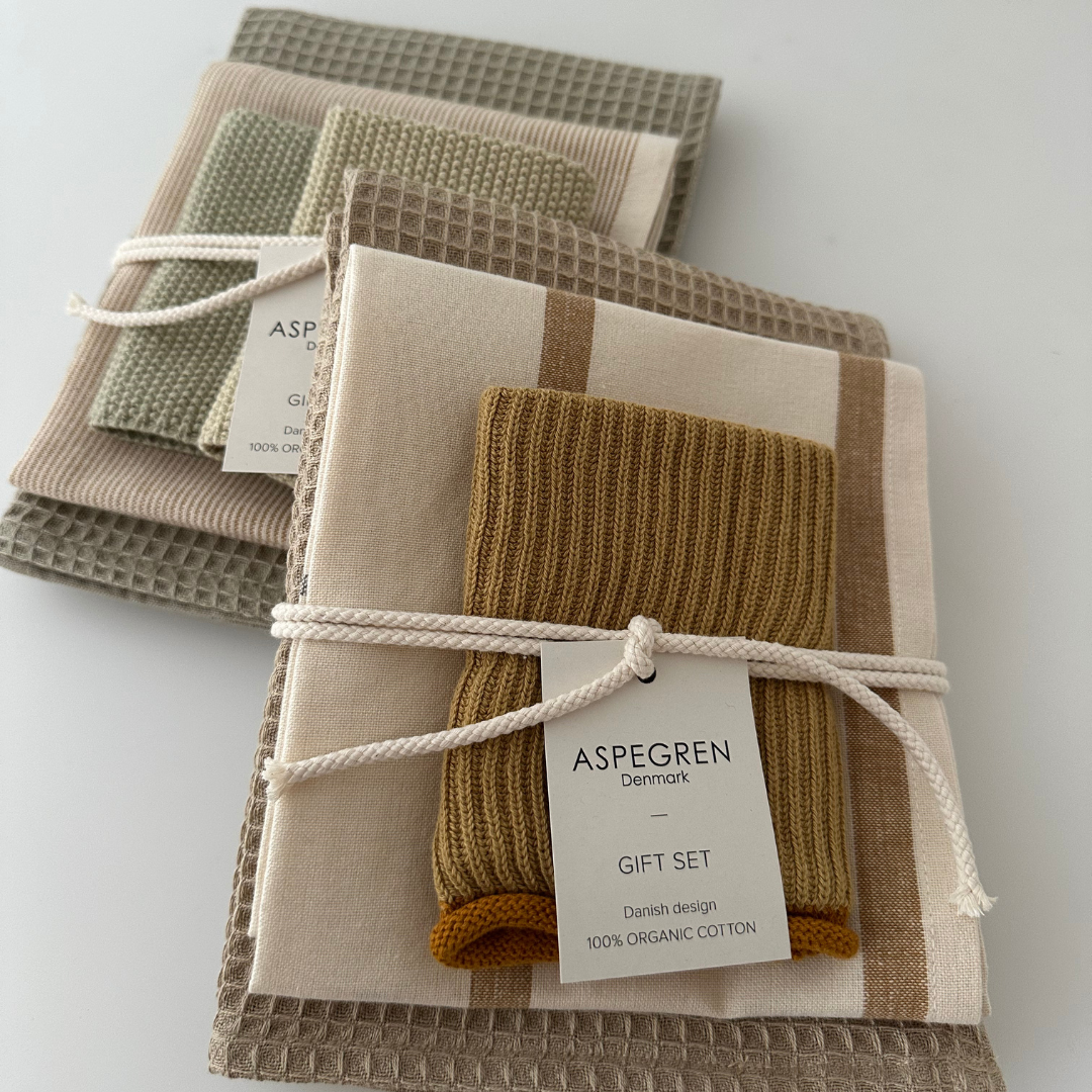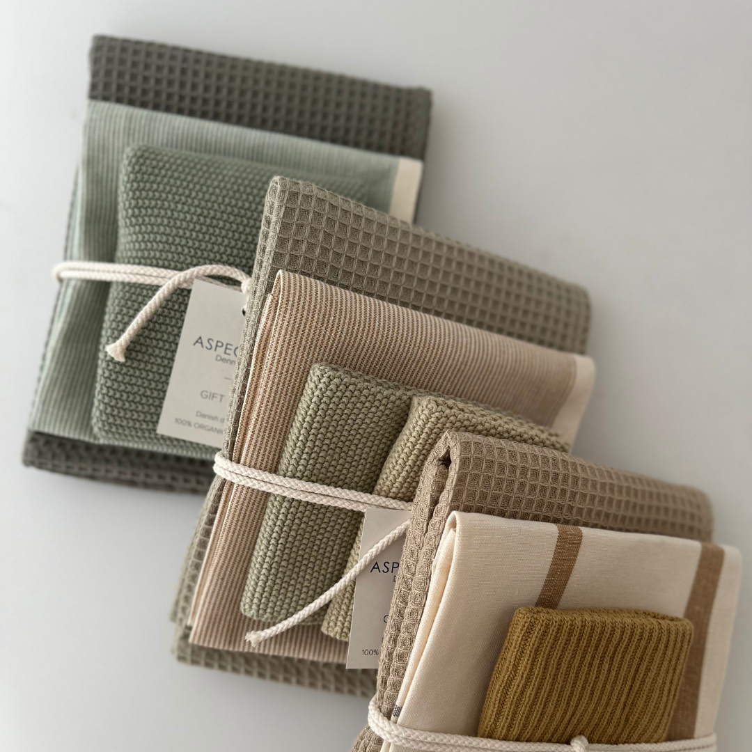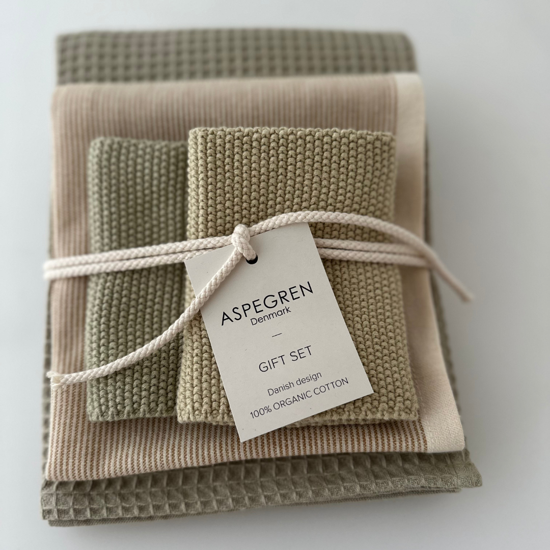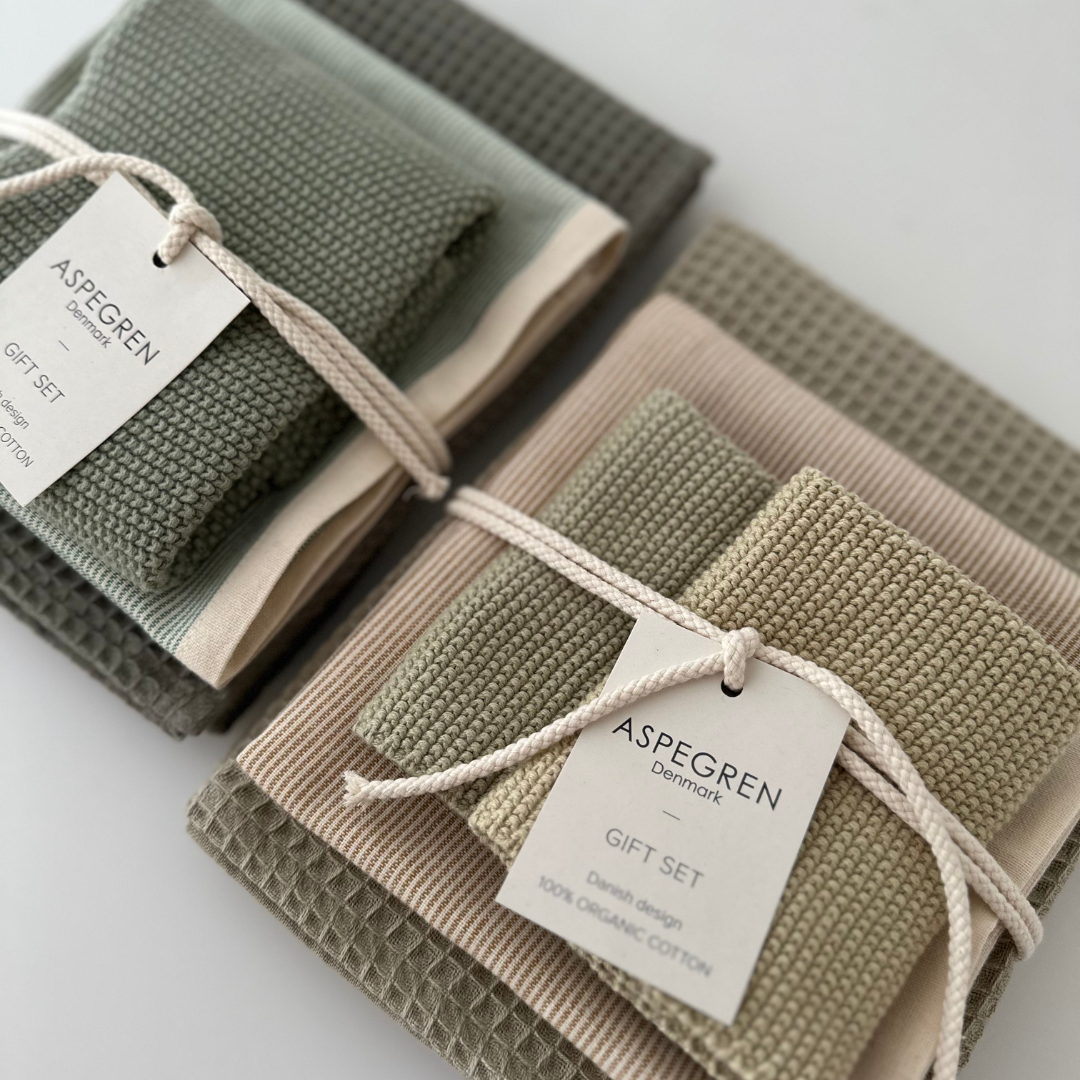 Sættet er en smuk gaveidé – både til dig selv og til én, du gerne vil forkæle. Perfekt som værtindegave eller som en lille luksus i hverdagen. Farverne passer naturligt ind i både hvide, sorte, grå og trætonede køkkener og tilfører samtidig elegance til mere farverige indretninger. Med matchende viskestykker og karklude er det let at skabe et harmonisk udtryk i køkkenet.